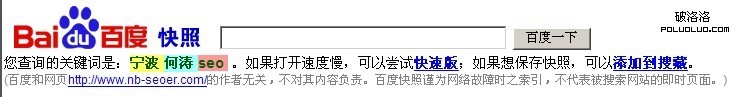 在說到分詞的時候我們不得不提一個東西,那就是我們如何來看網站一個分詞情況:在百度搜索引擎裡面搜索“寧波何濤SEO”在出面的搜索結果裡面,我們看下網站的那個快照如圖
