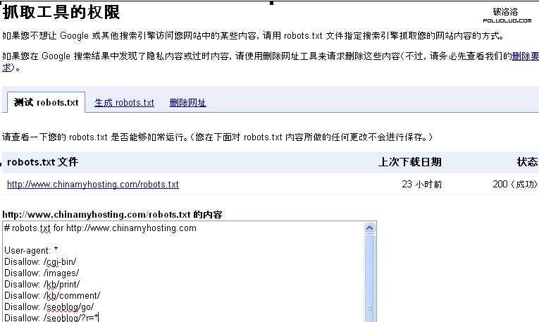 整個網站不能收錄或某個目錄下所有頁面都不能收錄,經常是因為robots.txt文件差錯引起的。網管工具抓取工具權限部分顯示出Google所抓取的robots文件內容,如圖3-32所示。