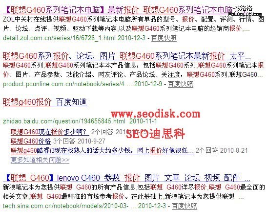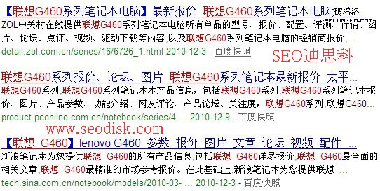 從以上不難發現:除了主關鍵詞“聯想G460”以外,“報價”為三個網站均含有的詞組,那麼再看“聯想G460報價”的結果