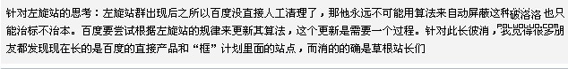 一、針對左旋哥:你的seo技術、利用強大的內鏈技術蜘蛛網迅速提高排名、站群技術發揮淋漓盡致是我們有目共睹的,厲害的您肯定利用了百度算法機制的漏洞才會有如此的“成就”,但是你的技術是否用錯了地方呢?讓百度再一次敗在你的手下,那你是否覺得很得意呢?或者誇張地說:“你這個醉翁之意根本不在左旋,在乎的是所有的行業。”