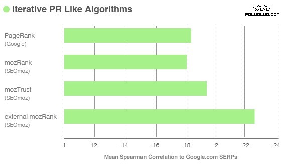這個沒有多少意外。如果你說在上面提到的PR准則裡沒有說外鏈比內鏈優秀,那麼我現在所說的是後1997時代Google的算法。那麼,我們使用mozRank的外鏈特性來觀察整個參數與實際排名的相關性後就發現外部頁面的相關性要高於標准mozRank參數。