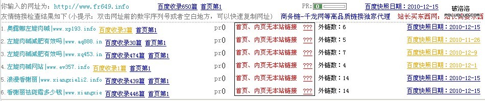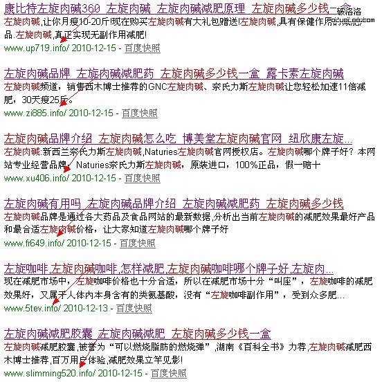 一、 我們來回顧上次被和諧左旋肉鹼的站群:域名是.info後綴的,域名注冊日期大是:2010-10-20,百度快照時間是12、15 ,也是差不多一個月取得很好的排名,這次的站群真的是死灰復燃,並非空穴來風,顯然左旋哥還是有備而來的。
