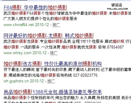 4.有效信息的展示度問題。這個問題是很多企業推廣都存在的問題。比如,搜索一些長尾關鍵詞,“武漢武昌區婚紗攝影哪個好?”這樣的詞,或者一些知識普及類的,會發現自己做的百度知道等百度產品,58分類信息等分類信息,或者是一些博客信息,排在自己網站的前面。本來說越多的信息對企業產品的推廣是沒什麼不好的,不過既然有能力把這些詞占據搜索引擎的大面積位置。如果排在前面的都是其他網站的內容,無形中就減少了客戶登錄企業網站的可能性。