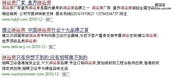 幾乎全部是企業網站排名,從這裡可以看出淋浴房這個詞競爭有多大,這個詞想上百度首頁非常困難,從這些站都聚集在第二頁就知道了。