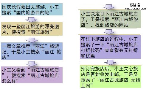 可以看到上面的流程圖,首先,要想在網上預訂酒店的客戶,需要對目標關鍵詞進行搜索,其次是通過品牌的探索,新渠道的發現,品牌的信任度,最後才是下訂單,並有機會進行回訪,增加信任。