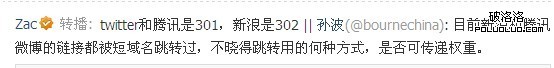 目前新浪和騰訊微博的鏈接都被短域名跳轉過,不清楚跳轉使用何種方式,是否可傳遞權重。