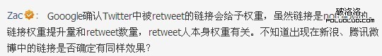 站長之家Chinaz.com 12月6日消息,著名的SEO大師 ZAC 在微博中稱,Gooogle已確認Twitter中被retweet的鏈接會給予權重,雖然鏈接是nofollow的。鏈接權重提升量和retweet數量,retweet人本身權重有關。ZAC 同時表示目前尚不清楚出現在新浪、騰訊微博中的鏈接是否確定有同樣效果。