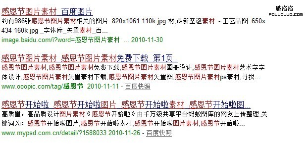 首先是圖片的標題需要符合游客搜索習慣,例如“最新感恩節圖片素材、2010感恩節圖片、最新感恩節素材”等等;頁面當中多次重復確定的關鍵詞,網頁的description,圖片上面加上ALT,合理利用好<h1>,這些都可以增加關鍵詞的密度,來提高關鍵詞的權重,從而獲得更好的搜索排名。