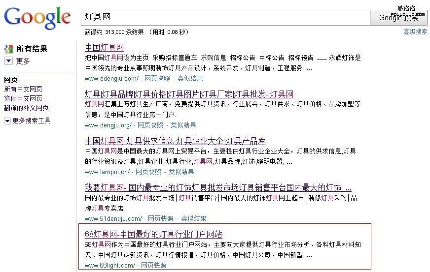 其實各位站長都知道百度更注重內容,google更注重外鏈。本人在2個月前為了試驗高質量鏈接效果如何,花了1300元為自己其中一個網站“68燈具網”購買了一個季度的10個pr6高質量的鏈接,購買2個星期左右google搜“燈具網”就排在了首頁第五位(圖一),排名一直維持到現在。而在百度該關鍵的排名始終在第8頁左右, 因為這個站大部分內容是采集的,原創很少,所以充分的證實了“百度注重內容,google注重外鏈”這個觀點。所以呢,我建議站長們如果依靠百度的流量,那還是先把自己網站的內容給做好,外鏈倒是次要的。相反,如果流量主要依靠google,那還是去想辦法找一些高質量的外鏈,效果會好一些。