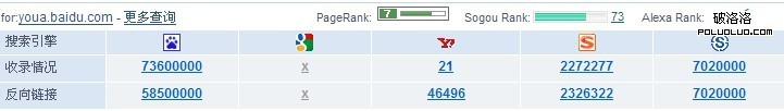 PR值,也就是用來標識網頁的等級或者重要性。級別從0到10級,10級為滿分。PR值越高說明該網頁越受 歡迎(越重要)。例如:一個PR值為1的網站表明這個網站不太具有流行度,而PR值為7到10則表明這個網站非常受歡迎(或者說極其重要)。