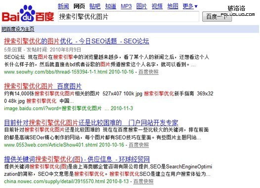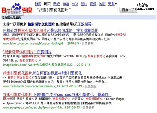 在輸入了含有雙引號的關鍵詞後,返回的結果是完全匹配了關鍵詞“搜索引擎優化圖片”文字的結果,而下面的圖片則是包含關鍵詞“搜索引擎優化圖片”且可能是分詞或組合詞的結果