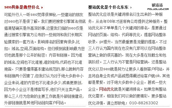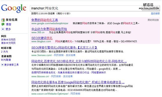 關鍵詞“網站優化”在搜索結果中有鏈接,這是大家經常在做外部鏈接時候常用的錨文本,檢查是否有效果的最有效方式,下圖為搜索結果的第一條中含有錨文本的區域。便於大家更容易去理解這條命令,可惜的是inanchor:只適合在google中使用。