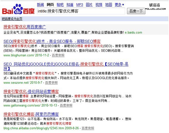 上圖為未增加intitle指令的搜索引擎結果,大家很容易發現只要在description或keyword或者正文有此關鍵詞都有可能被返回搜索結果,而運用了intitle之後如下圖,很容易看到搜索結果必須是在網站的title中包含關鍵詞才被返回。這條命令的最大價值在於對某個關鍵詞更加深入的了解競爭對手(大家都說title很重要嘛)。