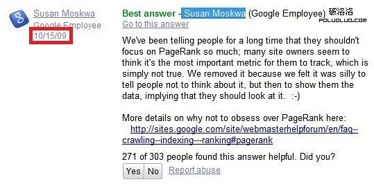 雖然有人說這個時間可能是注冊時間,不過後面的回復中有出現“11/6/09”,這樣的質疑自然也沒有了。同時,在維基PR的描述中也談到了這件事,大家可以去看看時間。 也就是說去年的一條回復才有了前陣子“PR不再更新”的新聞。 要是半個月前我也肯定匆匆發文談這個事了,不過最近在查看一些英文SEO博客時才發現國外SEOer根本沒人討論這件事,我才開始覺得蹊跷。