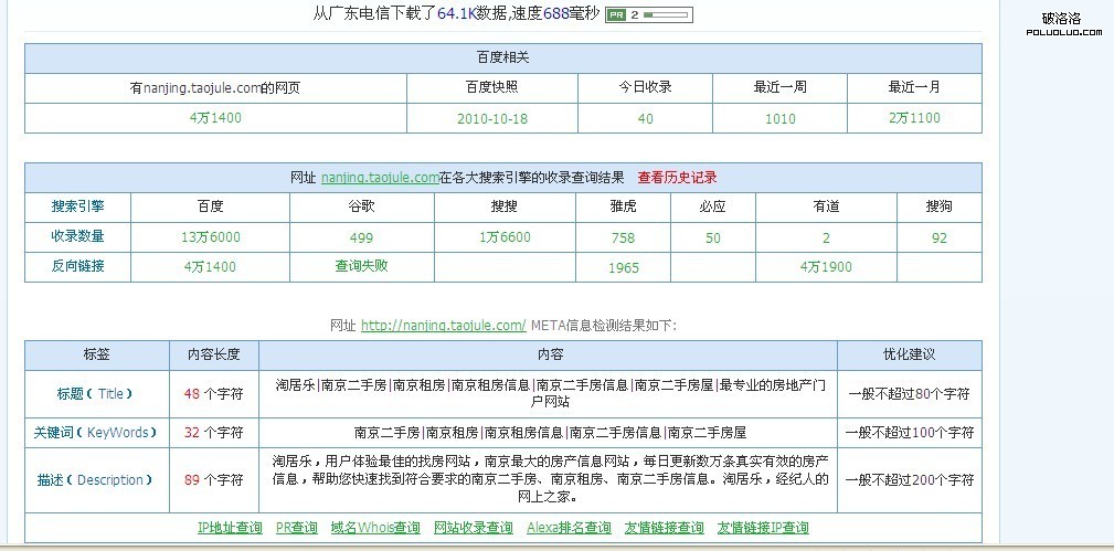 網站優化需要時間,更需要搜索引擎更新的時間,因此在制定優化的時間的時候,我們需要借助算法研究的規律,比如,百度姐姐的更新時間一般是:每周五左右的時間,而且是凌晨。更新哪些方面呢?主要有網站的快照、收錄、網站關鍵詞的排名。下面我將以一個南京二手房的具體網站收錄情況為例: