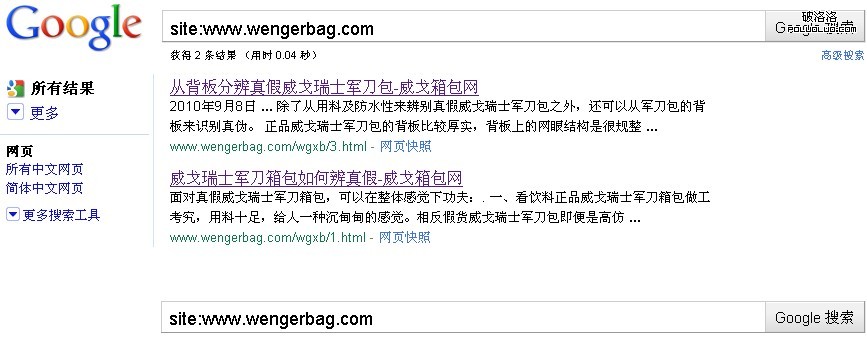 今天早上使用site:www.wengerbag.com搜 索收錄時,發現威戈箱包網被 SOSO收錄了,距離上線12小時。SOSO永遠都是那樣的善解人意!上線15小時後,goolge也收錄了威戈箱包網。google對新人站果然夠友好!