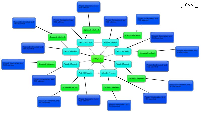 當然這兩幅沒有什麼說服力,都是站群結構圖,各自的思路不同而已,但是有誰知道他們的思路在那裡?為什麼圖要這樣畫,站群結果要這樣搭建?每一步的預期效果如何?針對這些圖的解析都很簡單,其實他們只是告訴你,我是這麼做的!可能對於我們新手來說,模仿也是一種學習,但是模仿一種本來存在爭議,而且極易導致被罰的方式去優化你的站點未免是不明智的。再看看下面這個