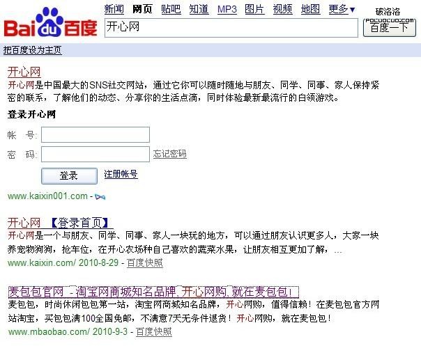 去搜索淘寶網的朋友,一般都是去淘寶網上消費的吧!這其中有沒有想去買包包的呢,如果你是去買包包的,那麼我相信大多數人是會直接點擊麥包包的網站,把淘寶的官方網站把忽略過去了!就算你不是去買包包的,這是你看到這個網站心裡是不是有個印象呢,當你想買包包的時候會不會想到,去麥包包呢?我想肯定會有一部分人會去的。這就是包包之外的流量截獲,它的價值意義深遠,可能給麥包包帶效益不如產品包包這個產品詞明顯,但長遠來說其商業價值是相當可觀的!如果大家細心觀察麥包包還做了另外一個深層次流量截獲,在標題中還有一個關鍵詞就是開心網,描述中也提到過兩次!大家在搜索開心網的時候,出現第三個如圖