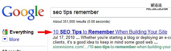 在查詢搜索關鍵詞"seo tips remember"之後,谷歌搜索結果顯示的 <title>值如下圖: