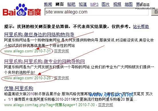 今天一大早來公司,公司一個同事就問Sun說自己的一個網站,今天在百度裡site了下,怎麼就出現了兩個首頁呢?讓Sun幫他分析下,是什麼原因。Sun也site:www.alilego.com看了下確實是這樣,如圖。