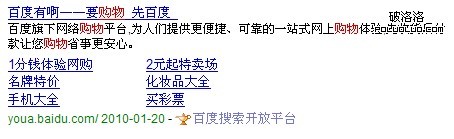 今天一個偶然的機會讓我看到了,類似於Google Sitelink現象的百度sitelink。就在剛才用百度,搜索“網上購物”或者是“購物”時,前面10條推廣後,在首頁出現了百度自家的購物平台:百度有啊。以上兩個詞,都可以觸發百度sitelink現象。如圖