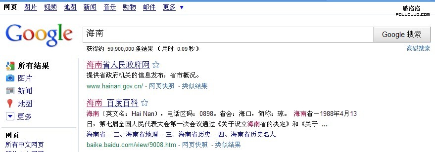 最近建海南二手房產網做關鍵詞分析的時候,發現“海南”一次在百度、GOOGLE中的排名都很好,以下是8月4號對百度、GOOGLE搜索引擎中搜索結果的截圖:
