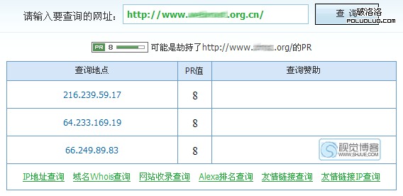 劫持過的PR,其真偽是可以被查詢到的。具體可以登錄站長工具——Google PR查詢:http://pr.chinaz.com/