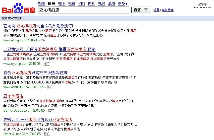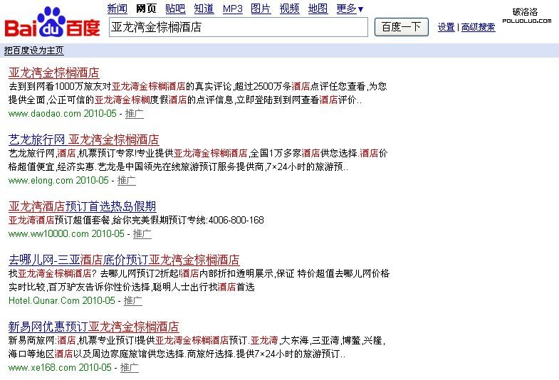 注意,“亞龍灣酒店”這個關鍵詞的第一位排名是藝龍,第二位是三亞攜游(像是一個本地站點),第三位是熱島假期(也像是本地站點),第四位則是到到。