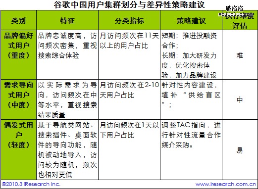 根據訪問深度不同,艾瑞咨詢將谷歌中國(google.cn)用戶分為品牌偏好式用戶(重度用戶)、需求導向式用戶(中度用戶)和偶發式用戶(輕度用戶),其類別特征及量化方式如下: