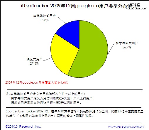 另據iUserTracker監測數據顯示,2009年7月至12月,谷歌中國月度覆蓋人數在1.5億左右,截至2009年12月,其月度覆蓋人數達到1.6億人,用戶普及程度極高。如此大規模的用戶,勢必存在不同的訪問特征、價值取向與遷徙趨勢,艾瑞咨詢分析認為,欲獲取潛在市場份額,針對不同類別用戶進行差異性策略尤為重要。
