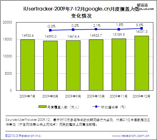 根據iResearch艾瑞咨詢推出的網民連續用戶行為研究系統iUserTracker最新數據顯示,2009年,谷歌中國的網頁搜索請求量份額為18.9%,僅次於百度列於市場第二,並顯著高於其他搜索引擎運營商,其用戶資源可見一斑。