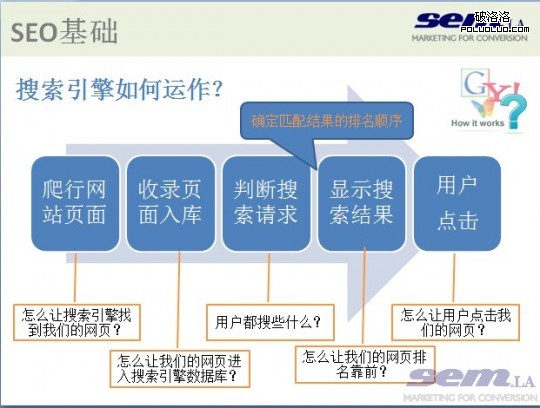 SEO是在處理網站、搜索引擎、搜索用戶三者之間的關系,所以SE的每一個重點運作流程都會是SEO要關注的。結合上圖和上面說的步驟,我們可以看到搜索引擎的流程與SEO的思路是一一對應的。