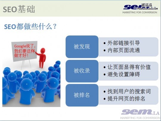 在整個應對、處理、解決、提高的過程中,SEO其實是比較被動的,所有的做法都是針對搜索引擎和用戶的喜好而進行的。所以,我在PPT裡使用了09年最流行“被字句”,而與一般的“被XX”不一樣,我們是希望被“被XX”而不是抗拒(囧!)。