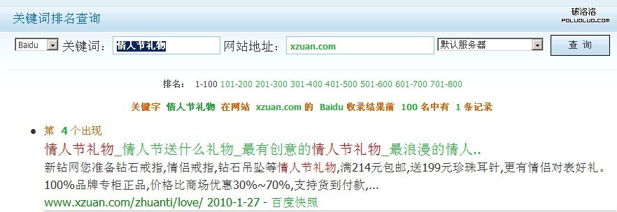 這個頁面www.xzuan.com/zhuanti/love/就是我當時所優化的頁面,整個專題是從元旦放假回來後開始做的,包括美工,頁面真正上線是在1月7號了,第二天谷歌就收錄了,而且在第二頁,或許大家會說網站本身就PR6了,這並不稀奇。然而百度去一直遲遲未收錄,直到1月20號的樣子,終於當我搜情人節禮物的時候,我的頁面出現在了百度40位的樣子,接下來又通過一周的努力終於在1月28號早晨,