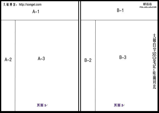 如下圖,頁面一及頁面二,是不同的網站上的兩個頁面。把這兩個頁面分成三個區域進行比較(即A-1、A-2、A-3和B-1、B-2、B-3),如 果這三個區域的頁面內容完全一致,則認為這兩個也米娜互為鏡像頁面