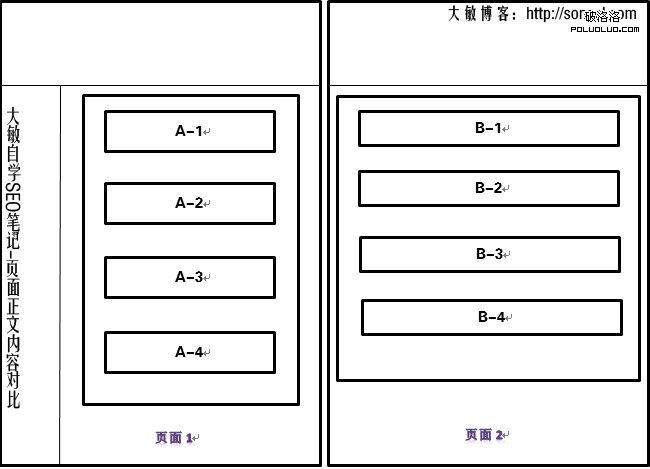 如下圖,頁面一與頁面二是不同網站上的兩個頁面,其中頁面1中的A和頁面2上的B分別是這兩個頁面上的正文內容。為了識別這兩個頁面是否互為轉載頁 面,搜索引擎先把這兩個頁面的正文內容分成四個區域進行比較。假設這四個區域中有3個是完全相同或者相似的,則認為這兩個頁面時互為轉載的。