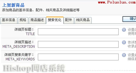 Hishop的強大功能體現在可以為單件商品做搜索引擎優化,打開商品管理-上架新商品-搜索優化我們可以看到對應的詳細頁描述META_DEscripttION,詳細頁搜索關鍵字META_KEYWORDS,頁面標題後台設置好後會在前台浏覽器的頂部顯示相應的標題,可以讓用戶一目了然。如圖: