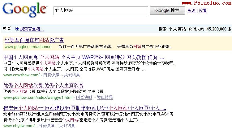 本例是經過網站重構後的網易主頁中的<meta>標簽內容,在Google中搜索“個人網站”顯示的結果如圖所示。網絡蜘蛛會自動檢查“Description”即網站內容描述中的內容,作為顯示結果中網站的描述。