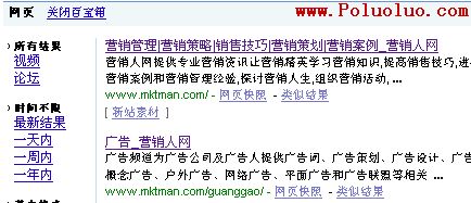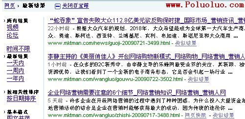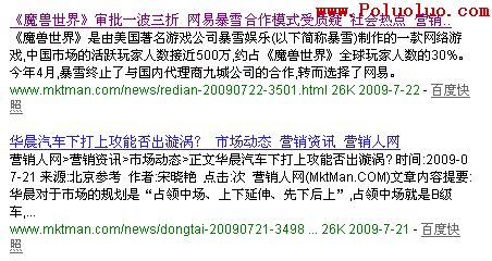 這個比較簡單只要在百度和Google中SITE:要鏈接的網站網址就可以看出最新的快照日期了,如site:www.mktman.com,百度快照如圖示