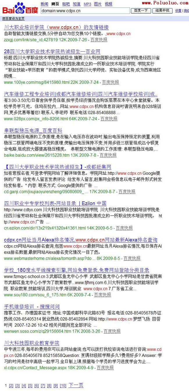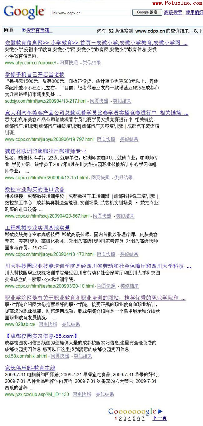 以前我沒太在意過這之間的差異,也或許以前兩者的差異並不明顯,所以我也是最近才有所發現。以我們學校網站為例:四川大學職業技術學院,域名www.cdpx.cn,百度收錄反向鏈接3110頁,谷歌收錄反向鏈接62頁。相差竟然有3000頁,不能不說是差異巨大,那麼為什麼會出現這種反向鏈接認定的巨大差異呢?通過下面的截圖,我們來分析一下其中的原理。
