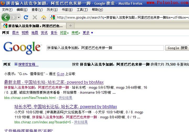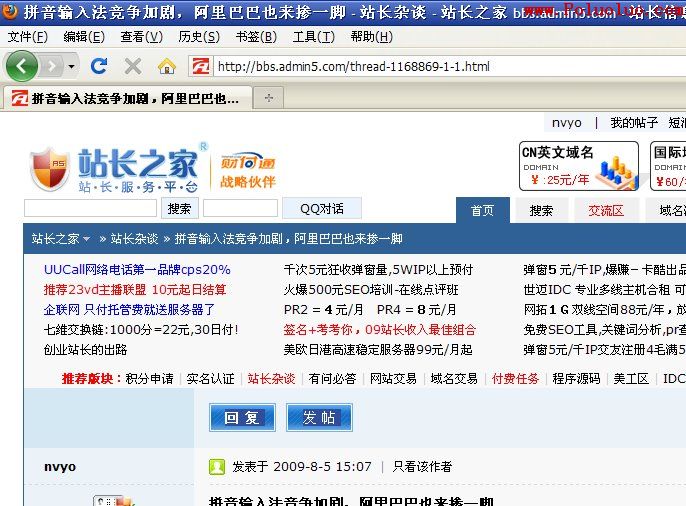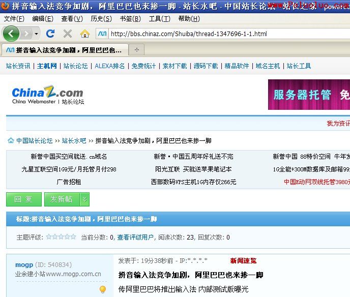 測試辦法,首先在ADMIN5和CHINAZ論壇上發一篇文章,標題為“拼音輸入法競爭加劇,阿裡巴巴也來摻一腳”,地址分別是:http://bbs.admin5.com/thread-1168869-1-1.html,