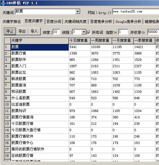 以前百度會提供相關搜索更多頁面,但是後來被百度關閉了,只有競價用戶才能看到,這部門關鍵字數據是非常有用的,之後便產生了很多的關鍵字選取軟件,軟件的數據來源是百度指數,也就是原先的相關搜索,比如最常見的有SEO伴侶,SEO助手(這兩款都是付費軟件)免費的也可以用,但是出來的關鍵字很少,而且可能還被禁止導出,SEO伴侶我一直在用,價格一年也就幾十元,我記得好像是35元!SEO助手價格相對比較貴,但是裡面除了這個功能外,其他功能還有很多,還有最新的一個網站叫追詞網(http://www.zhuici.com/ )這個網站不需要給錢,但是需要用一個PR=3的鏈接換取VIP會員級別,有資源的可以去用一下!下面我以SEO伴侶為示范,找出“股票”相關的關鍵字~~