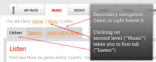 在上面的例子中,Slicethepie 冒險迫使用戶使用太多的導航選擇。(1)主導航, (2) 面包屑路徑和(3) 次要導航太接近了。這個應用中的面包屑路徑不能為用戶提供額外的便利,因為下一級頁面的次要導航正好在它下面。而且,當點擊面包屑的二級鏈接“Music”時,它將帶你到第一個tab“Listen”,這會錯誤的暗示第一個tab在另外兩個tab(“Search”和“Artist hall of fame”)的較高級別。