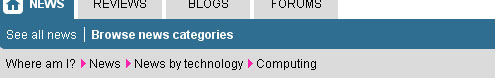 基於位置(Location-based)的面包屑向用戶顯示他們在網站的哪一個級別頁面。它們一般典型的用於有多個級別(一般是多於兩級)的導航方案。在下面的例子中(來自於SitePoint),每一個頁面的文本鏈接表示它比它右邊的文本鏈接高一級。