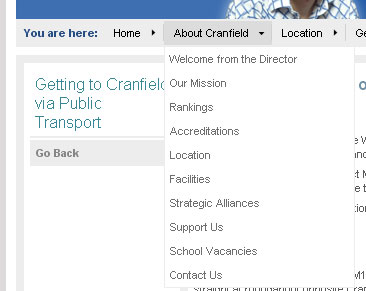 Cranfield University 有一個簡單的彈出面包屑,它提供多種功能:為用戶指示位置,並作為一種健壯和交互的二級導航。