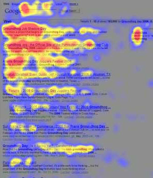 4、人們對搜索引擎,比如Google的搜索結果頁面的反應也是F型的,人們往下看搜索結果,也是勉強的,換句話說,將你的網站排名在搜索結果頁的前一兩位,直接決定了你網站受關注的程度。