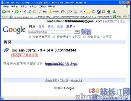 看看這個小計算題:log((sin(30))^2)-3+pi=?怎麼樣,難倒了吧?沒關系,有Goolge呢?打開Goolge,直接在搜索欄中輸入相應的計算公式,例如“log((sin(30))^2)-3+pi”,按下回車鍵後,你便會驚喜的發現,結果已經出現在眼前了,如圖2: