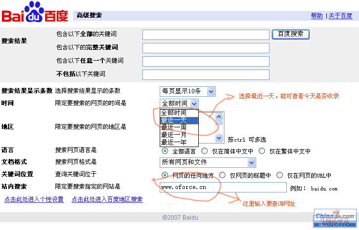相信做網站的朋友都很關心搜索引擎的收錄,每天查看收錄已經成為一種習慣,我們一般都是用site:www.oforce.cn的形式來查看,但只想知道特定時間內的收錄情況,應該怎麼做呢?那就要用到搜索的高級搜索功能了,現在用百度的高級搜索要看一下吧!