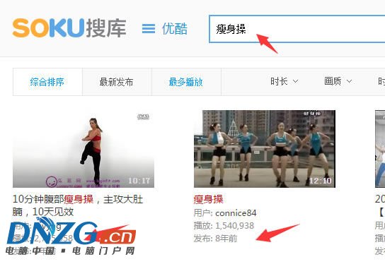 :尋找與你要銷售的產品相關的視頻。(如果是自己錄制視頻的朋友,這一步可以忽略。)咱們還是以減肥產品為例,直接到各大視頻網站搜索:“減肥操”這個關鍵詞,如圖: