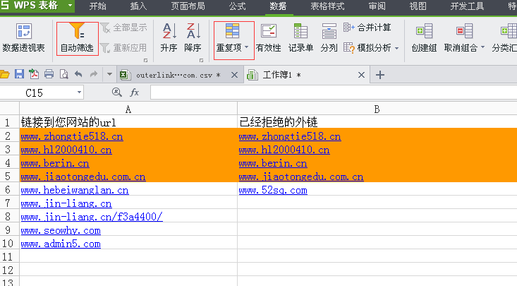 大家把最新更新的外鏈數據表格和已經拒絕的外鏈表格下載下來,然後根據上面說到的方法,得到一級域名或者二級域名,分別放在excel裡面A列和B列,然後全選A列和B列,選擇excel當中的“數據-重復項-高亮顯示重復值”,這樣的話就可以把A和B當中相同的url顯示成另外一個顏色。